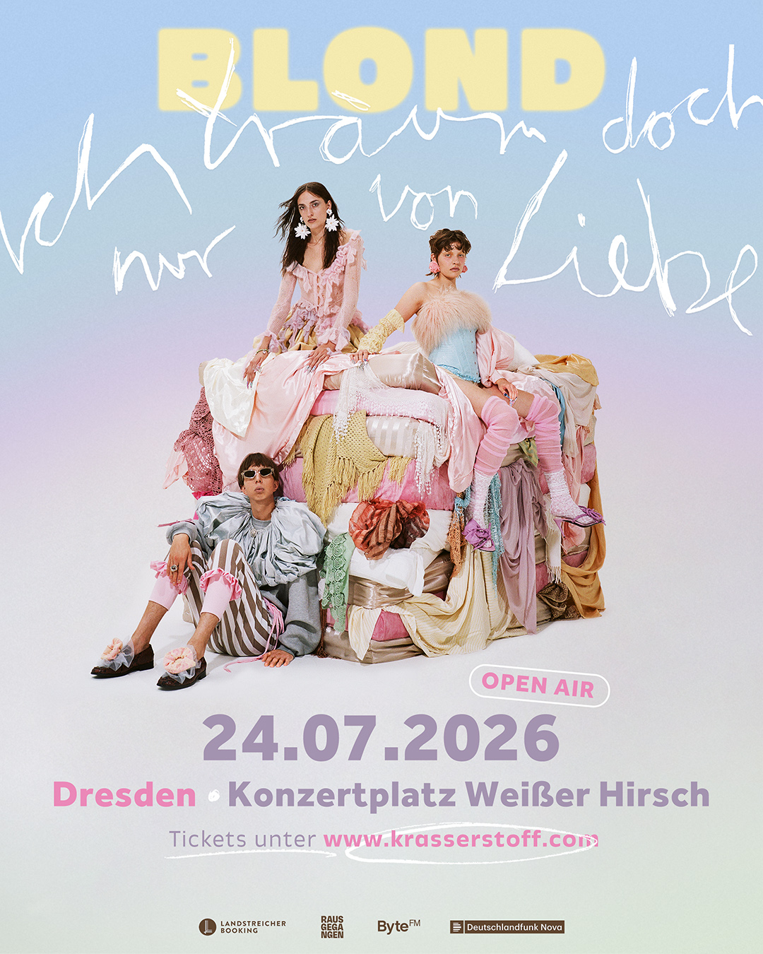 Blond "Ich träum doch nur von Liebe Tour 2026 - Open Airs" Präsentiert von: Rausgegangen, Byte.FM & DLF Nova Einlass: 18:00 Uhr Beginn: 19:30 Uhr